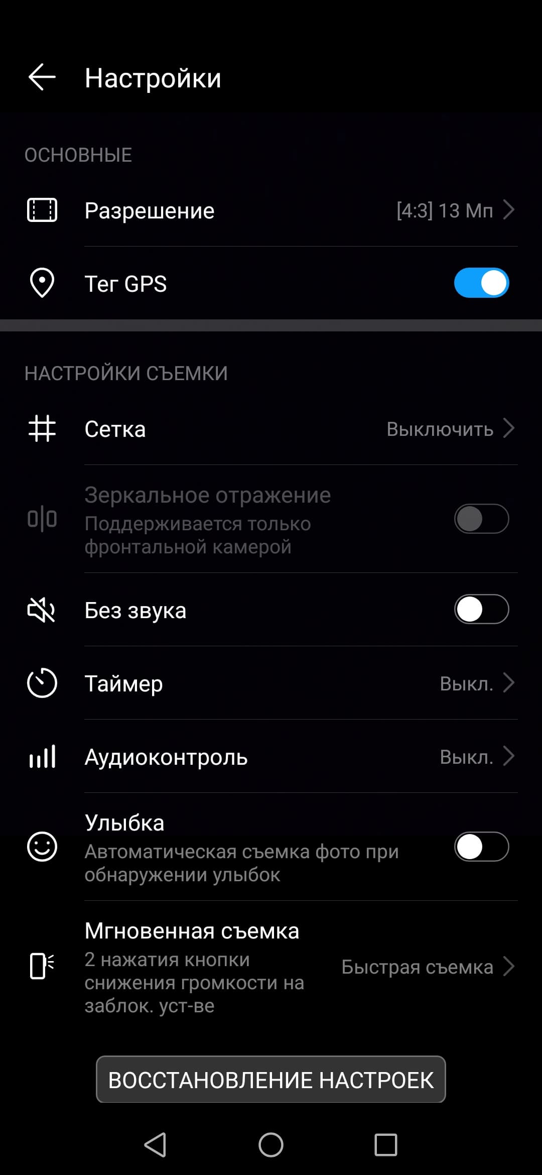 Работа камеры управляется ИИ, который в реальном времени идентифицирует более 500 видов сцен в 22 категориях, устанавливая оптимальные, по мнению автоматики, параметры съемки. Как обычно, есть несколько отдельных режимов, но их тут меньше, чем обычно: есть ночной и портретный, но нет монохромного. В ночном режиме, как и у старших моделей смартфонов Huawei, камера моделирует режим длительной выдержки в 4 секунды, склеивая несколько снимков в один. Штатной возможности сохранять снимки в RAW нет даже в ручном режиме.