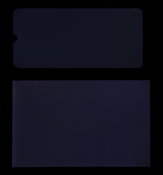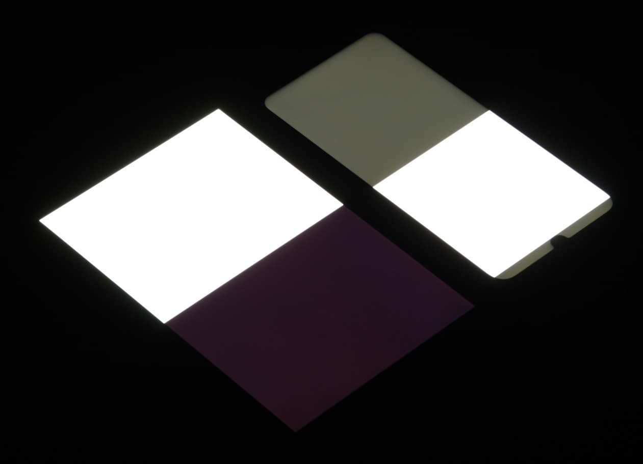 Яркость под углом у экранов уменьшилась (примерно в 5 раз, исходя из разницы в выдержке), но у Huawei P Smart 2019 экран все же немного светлее. Черное поле при отклонении по диагонали высветляется сильно и остается условно нейтрально-серным. Фотографии ниже это демонстрируют (яркость белых участков в перпендикулярном плоскости экранов направлении одинаковая!):