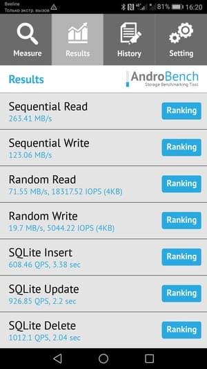 Результаты теста AndroBench на скорость работы с памятью: