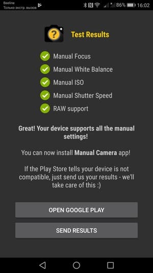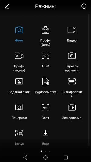 При включении ручного режима управления появляется горизонтальный ползунок с изменяемыми значениями выдержки (от 1/4000 до 8 с), светочувствительности (до ISO 1600), баланса белого, вариантов фокусировки и шкалой экспокоррекции. Традиционно для интерфейса камер Huawei, присутствует масса разнообразных сценических и специализированных режимов, в том числе и скачиваемых дополнительно (режим еды, светопись, аудиозаметка, сканирование и т. д.).