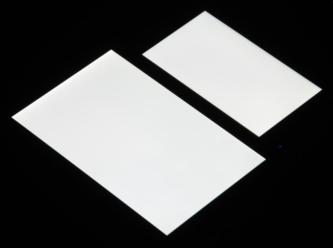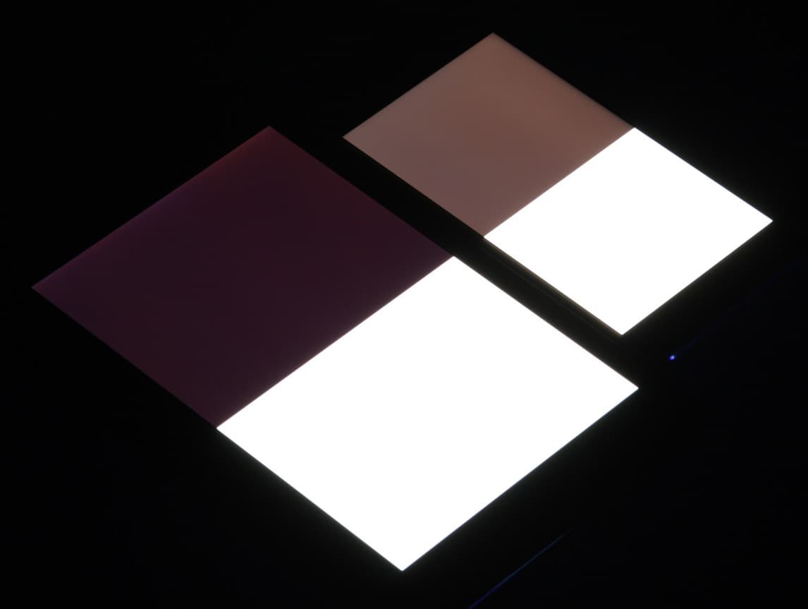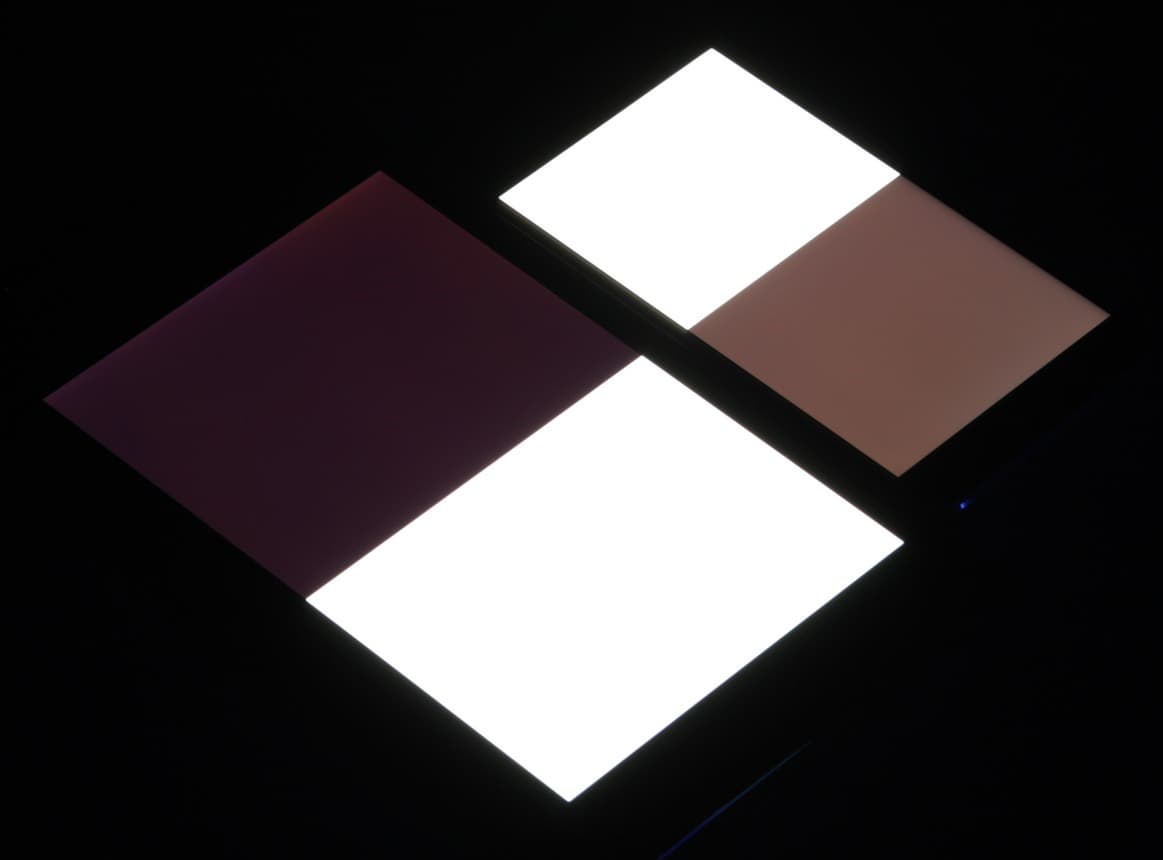 Яркость под углом у экранов уменьшилась (как минимум в 5 раз, исходя из разницы в выдержке), но у Huawei P10 lite экран все же немного темнее. Черное поле при отклонении по диагонали высветляется сильно и приобретает красноватый оттенок. Фотографии ниже это демонстрируют (яркость белых участков в перпендикулярном плоскости экранов направлении одинаковая!):