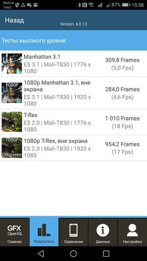 Платформа демонстрирует по результатам всех тестов вполне уверенный средний уровень. Возможности этой SoC находятся где-то между Qualcomm Snapdragon 435 и Snapdragon 625. В комплексном тесте AnTuTu Kirin 658 выдает не более 57К очков.