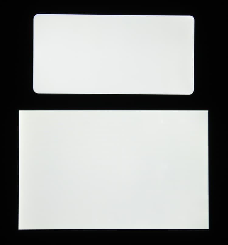 Яркость под углом у экранов уменьшилась (как минимум в 5 раз, исходя из разницы в выдержке), но у Huawei P20 Lite экран все же немного темнее. Черное поле при отклонении по диагонали высветляется сильно и приобретает фиолетовый оттенок. Фотографии ниже это демонстрируют (яркость белых участков в перпендикулярном плоскости экранов направлении одинаковая!):