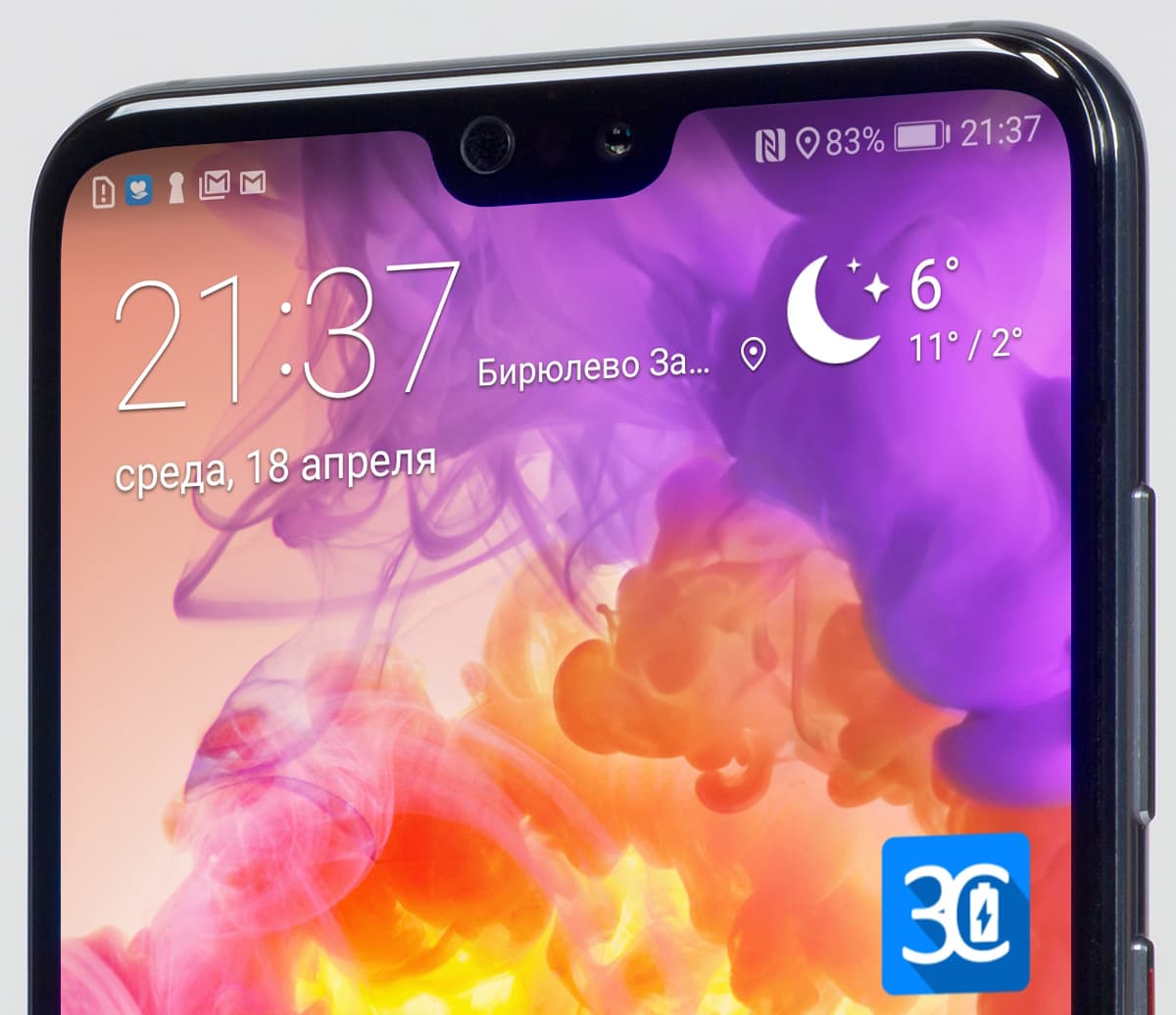 В верхней части экрана присутствует пресловутая «челка», лихо перенятая всеми производителями у Apple буквально в одночасье. У самого экрана сильно закругленные углы, а защитное стекло имеет покатые края. Над экраном установлен светодиодный индикатор событий — эта микроскопическая точка в районе «моноброви» едва видна, но она присутствует.