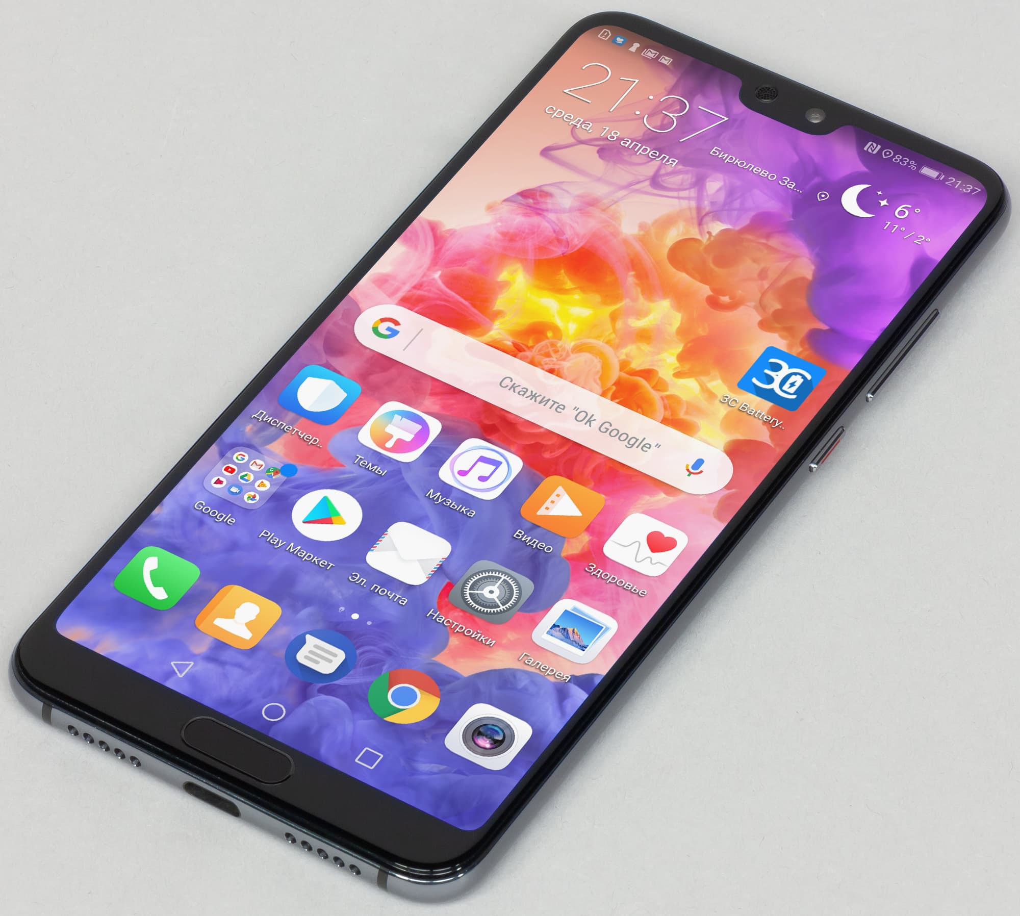 Цветопередача хорошая, цвета в меру насыщенные, цветовой баланс у экранов немного различается. Напомним, что фотография не может служить надежным источником сведений о качестве цветопередачи и приводится только для условной наглядной иллюстрации. В частности, выраженный красноватый оттенок белого и серого полей, присутствующий на фотографиях экрана Huawei P20 Pro, при перпендикулярном взгляде визуально отсутствует, что подтверждается аппаратными тестами с помощью спектрофотометра. Причина в том, что спектральная чувствительность матрицы фотоаппарата неточно совпадает с этой характеристикой человеческого зрения.