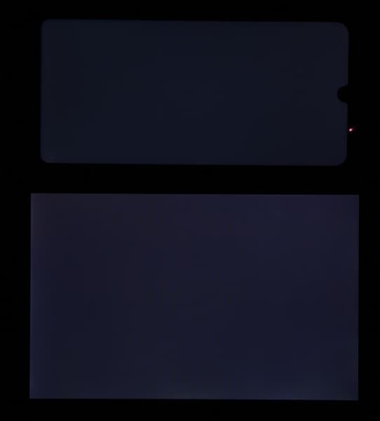 Яркость под углом у экранов уменьшилась (как минимум в 5 раз, исходя из разницы в выдержке), но у Huawei P30 lite экран все же немного темнее. Черное поле при отклонении по диагонали высветляется сильно, но остается условно нейтрально-серым. Фотографии ниже это демонстрируют (яркость белых участков в перпендикулярном плоскости экранов направлении одинаковая!):