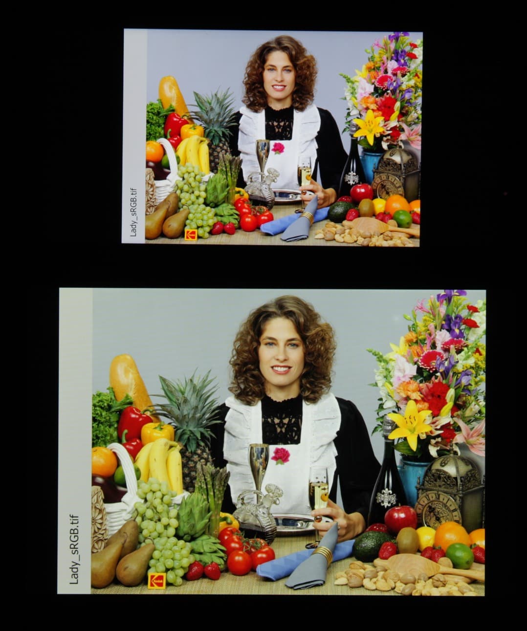 Спектры компонент достаточно хорошо разделены, что и обуславливает широкий цветовой охват. Для потребительского устройства широкий цветовой охват является никак не достоинством, а существенным недостатком, поскольку в итоге цвета изображений — рисунков, фотографий и фильмов, — ориентированных на пространство sRGB (а таких подавляющее большинство), имеют неестественную насыщенность. Особенно это заметно на узнаваемых оттенках, например на оттенках кожи. Результат приведен на фотографиях выше.