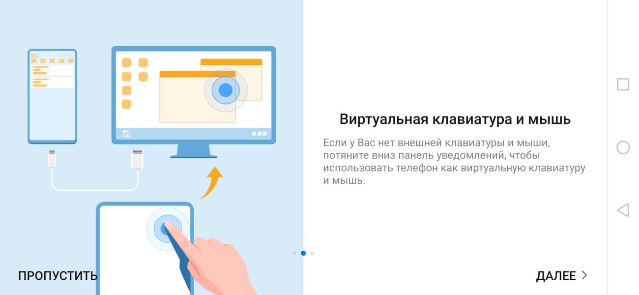 Управляющая панель в нижней части экрана убирается при выводе изображения на весь экран (например, при воспроизведении видео). Вывод осуществляется уже в истинном разрешении 1920×1080 и точка в точку. Отметим, что одновременно с выводом изображения и звука можно по USB подключать к смартфону мышь и клавиатуру, USB-флешки, использовать картовод и т. д., превращая смартфон в основу для рабочего места, но для этого адаптер или монитор (имеющий вход USB Type-C) должны допускать подключение внешних USB-устройств (то есть иметь USB-концентратор). В режиме рабочего стола на внешнем мониторе можно параллельно работать на самом смартфоне, то есть получается два рабочих стола одновременно, но вывод видео в режиме аппаратного декодирования осуществляется только на один экран, также одна и та же программа не может работать и там, и там.