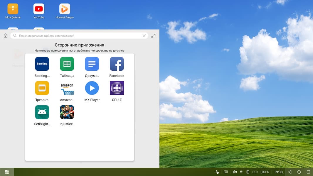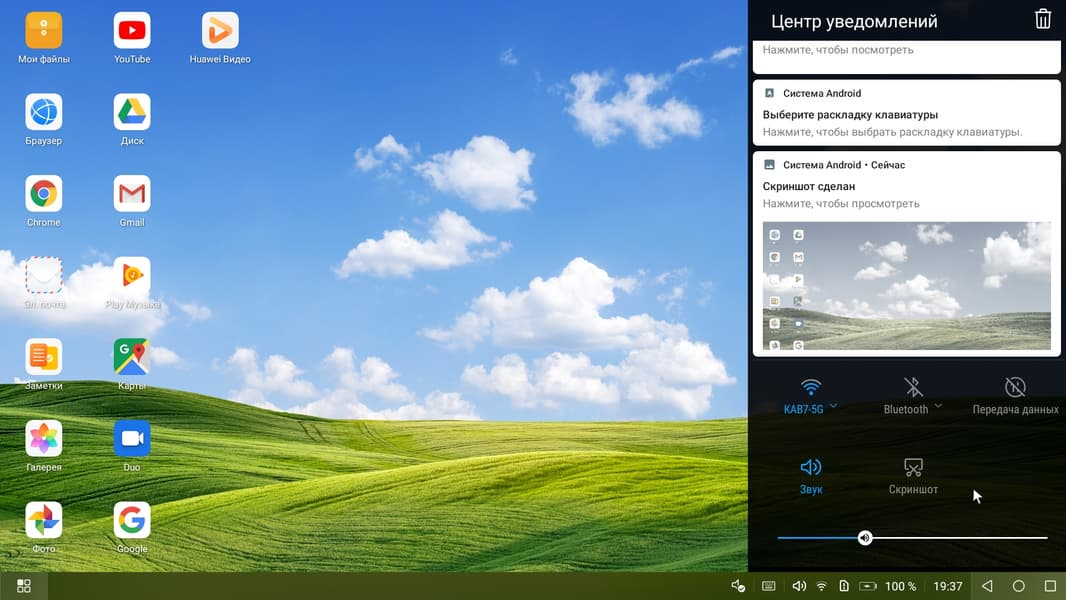 Во втором случае при портретной ориентации экрана смартфона картинка на мониторе Full HD выводится вписанной по высоте и с широкими черными полями по бокам, а при ландшафтной — вписанной по ширине с узкими черными полями сверху и снизу. Вывода точка в точку в обоих вариантах нет. В режиме альтернативного рабочего стола на монитор выводится совершенно другой основной экран, а экран смартфона может использоваться в качестве сенсорной панели координатного ввода, или работать как обычно, вторым рабочим столом небольшого размера. Вот пример рабочего стола на экране монитора: