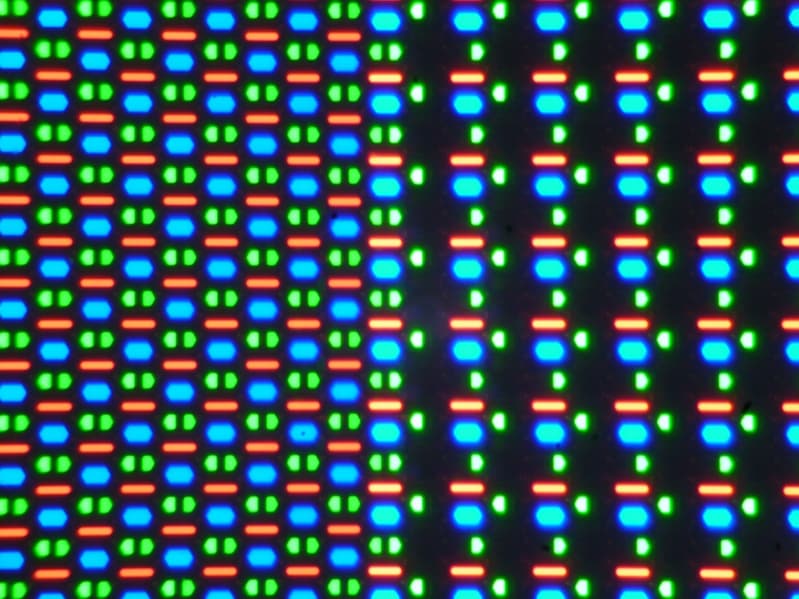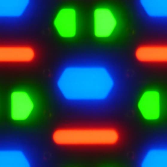 В этом экране используется матрица AMOLED — активная матрица на органических светодиодах. Полноцветное изображение создается с помощью субпикселей трех цветов — красного (R), зеленого (G) и синего (B), но красных и синих субпикселей в два раза меньше, что можно обозначить как RGBG. Это подтверждается фрагментом микрофотографии:
