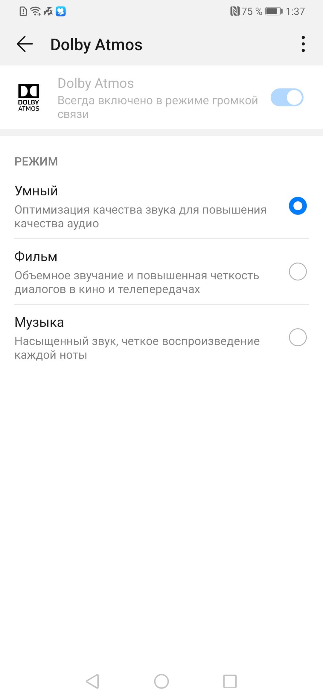 Что касается наушников, то для них 3,5-миллиметровый аудиовыход, к сожалению, не предусмотрели. Но зато аппарат поддерживает все кодеки для работы беспроводных наушников: aptX и aptX HD, LDAC HD, а также HWA Audio собственной разработки. Настройки Dolby Atmos позволяют внести изменения на собственный вкус, звучит в наушниках аппарат достойно.