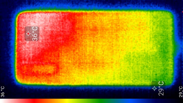 Нагрев локализован в верхней левой части аппарата, что, видимо, соответствует расположению микросхемы SoC. По данным теплокамеры, максимальный нагрев составил всего 36 градусов (при температуре окружающего воздуха в 24 градуса), это относительно немного.