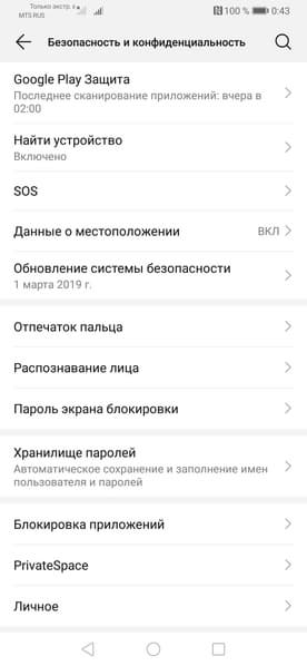 Имеется функция разблокировки по лицу, но в Huawei P30 Pro нет ни специального сканера радужной оболочки глаза, ни инфракрасной камеры. Поэтому функция разблокировки работает лишь с помощью фронтальной камеры. В темноте смартфон пытается поднимать яркость экрана, чтобы достаточно осветить лицо владельца и выполнить такую разблокировку, но обычно этот вариант не срабатывает — приходится использовать сканер отпечатков пальцев.