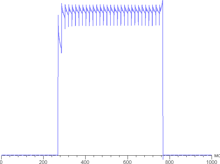 Переключение состояния элементов матрицы выполняется практически мгновенно, но на фронте включения может присутствовать ступенька шириной примерно 17 мс (что соответствует частоте обновления экрана в 60 Гц). Например, так выглядит зависимость яркости от времени при переходе от черного к белому и обратно: