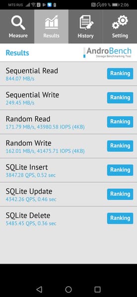 Результаты теста AndroBench на скорость работы с памятью: