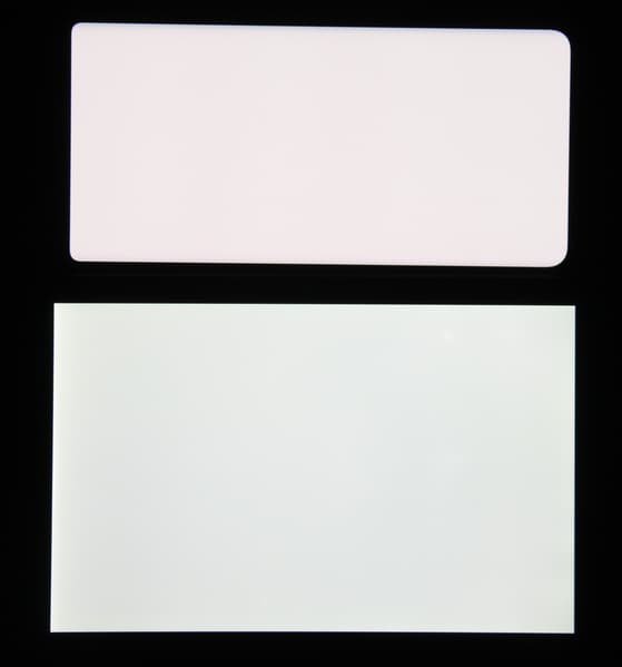 Экран характеризуется великолепными углами обзора. Правда, белый цвет при отклонении даже на небольшие углы приобретает едва заметный сине-зеленый или розоватый оттенок. Загнутые края усиливают видимость этого эффекта: даже при небольшом наклоне экрана один его длинный край розоватый, а противоположный — синеватый. Смотрится не очень хорошо. Зато черный цвет остается просто черным под любыми углами. Он настолько черный, что параметр контрастности в данном случае неприменим. Для сравнения приведем фотографии, на которых на экраны Huawei P30 Pro (профиль Обычные [цвета]) и второго участника сравнения выведены одинаковые изображения, при этом яркость экранов изначально установлена примерно на 200 кд/м², а цветовой баланс на фотоаппарате принудительно переключен на 6500 К.
