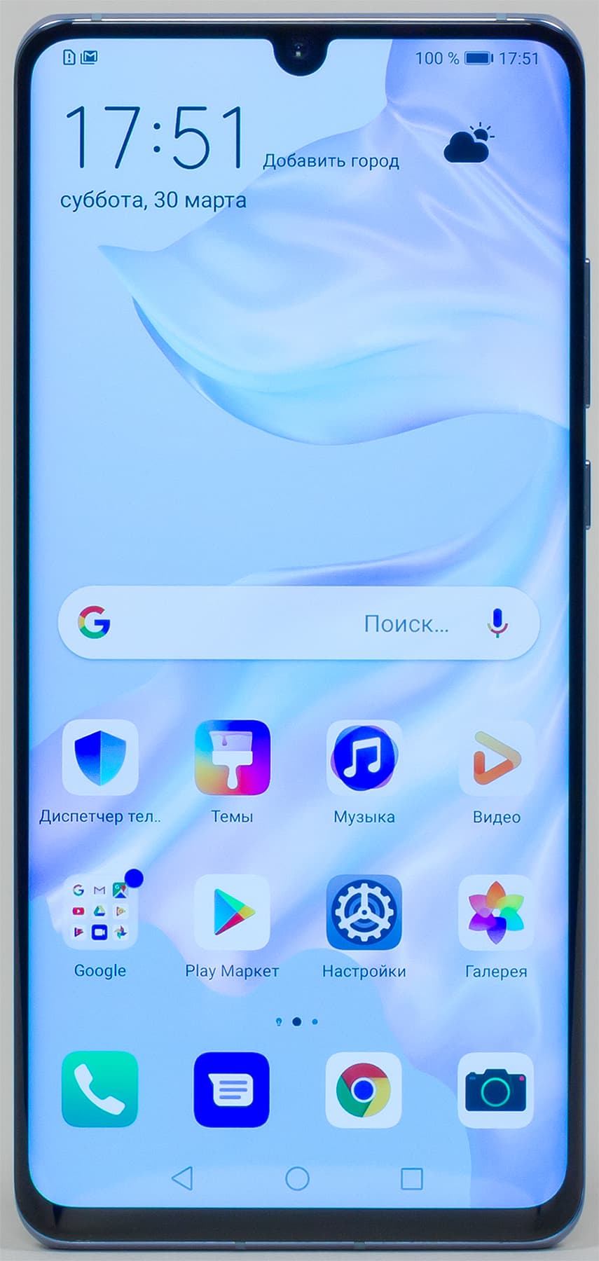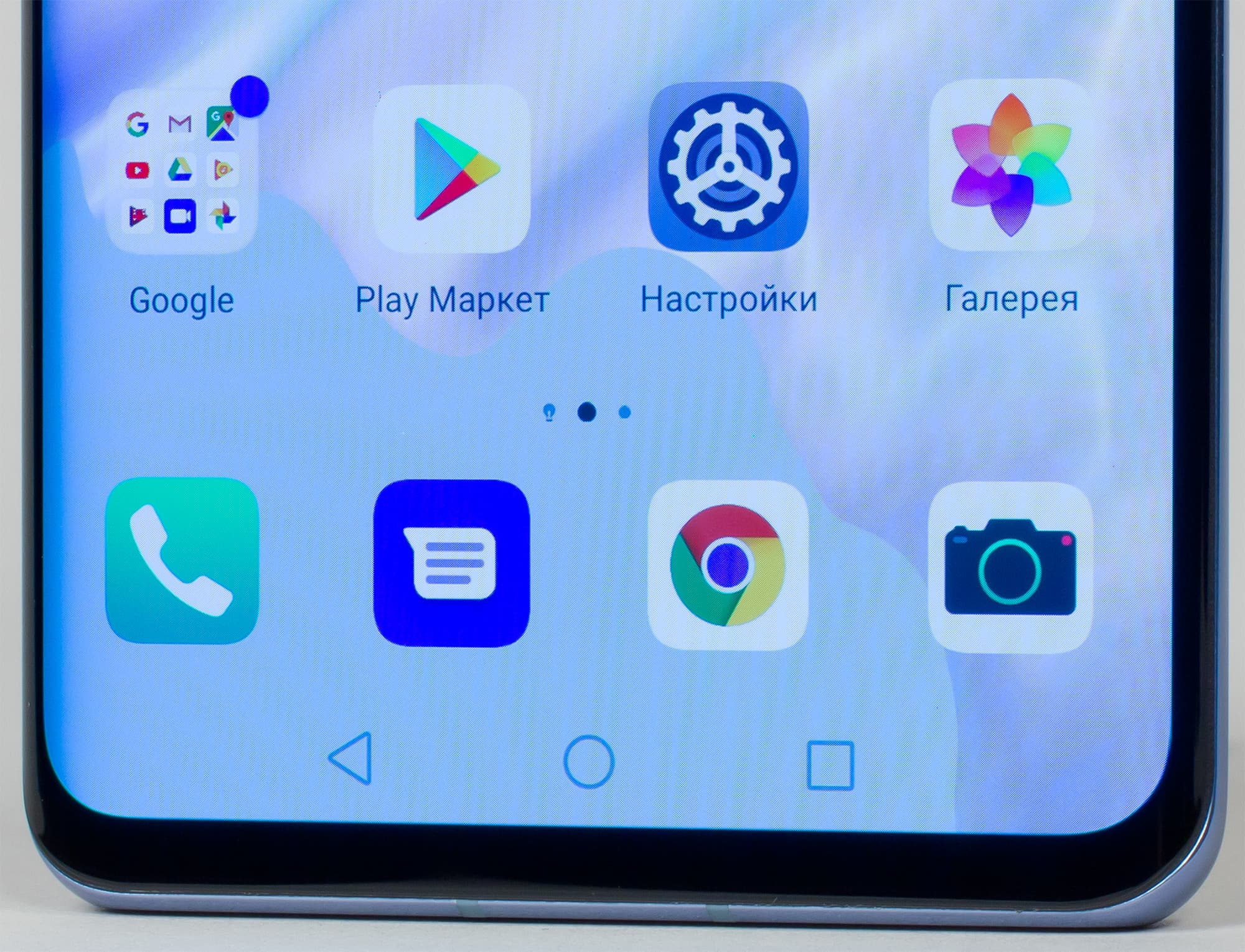 Цветопередача хорошая, цвета в меру насыщенные, цветовой баланс у экранов немного различается. Напомним, что фотография не может служить надежным источником сведений о качестве цветопередачи и приводится только для условной наглядной иллюстрации. В частности, выраженный красноватый оттенок белого и серого полей, присутствующий на фотографиях экрана Huawei P30 Pro, при перпендикулярном взгляде визуально отсутствует, что подтверждается аппаратными тестами с помощью спектрофотометра. Причина в том, что спектральная чувствительность матрицы фотоаппарата неточно совпадает с этой характеристикой человеческого зрения. Заметим, что в данном случае картинка занимает в высоту (при ландшафтной ориентации экрана) всю доступную для вывода изображения область и заходит на загнутые края экрана, что приводит к легкому затемнению и искажению цвета. Также на свету эти области почти всегда бликуют, что еще больше мешает при просмотре изображений, выведенных на весь экран.