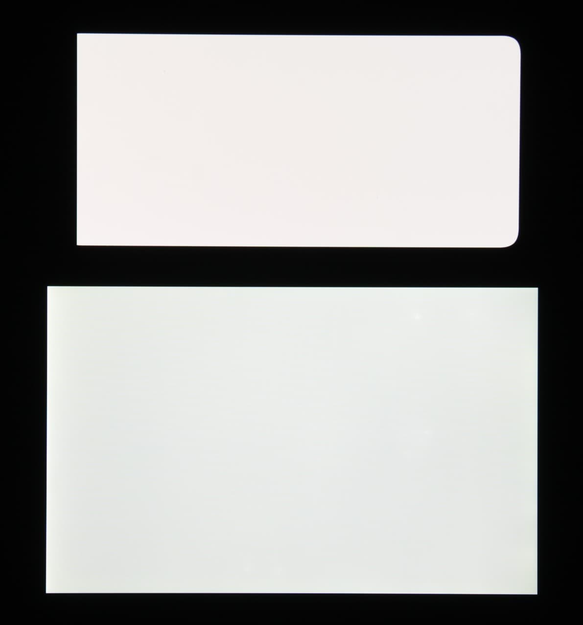 Экран характеризуется великолепными углами обзора. Правда, белый цвет при отклонении даже на небольшие углы приобретает едва заметный сине-зеленый или розоватый оттенок. Зато черный цвет остается просто черным под любыми углами. Он настолько черный, что параметр контрастности в данном случае неприменим. Для сравнения приведем фотографии, на которых на экраны Huawei P30 (профиль Обычные [цвета]) и второго участника сравнения выведены одинаковые изображения, при этом яркость экранов изначально установлена примерно на 200 кд/м², а цветовой баланс на фотоаппарате принудительно переключен на 6500 К.