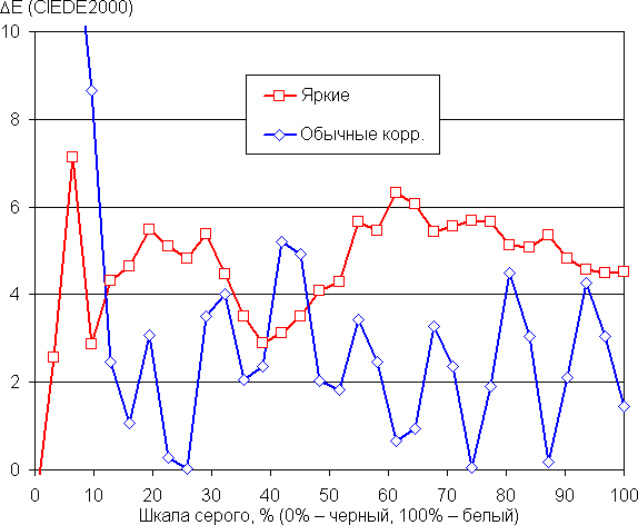 В этом устройстве есть возможность скорректировать цветовой баланс с помощью выбора профиля цветовой температуры или регулировки оттенка на цветовом круге. Что мы и попытались сделать. Удалось чуть снизить ΔE и в общем-то все (графики с подписью Обычные корр.).