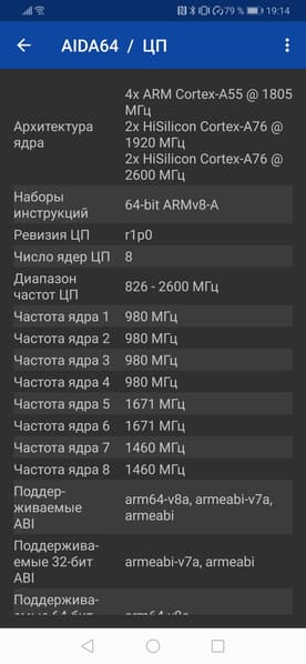 - SoC Huawei Kirin 980, 8 ядер: 2×Cortex-A76 @2,6 ГГц, 2×Cortex-A76 @1,9 ГГц, 4×Cortex-A55 @1,8 ГГц