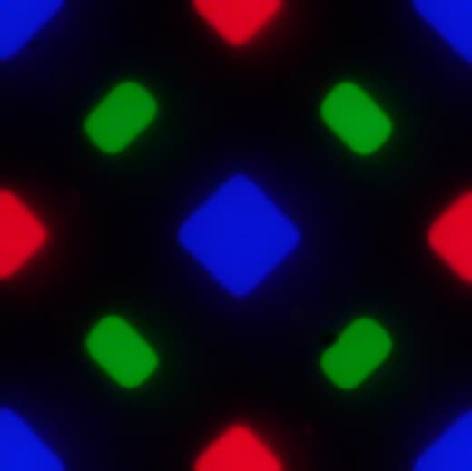 На фрагменте выше можно насчитать 4 зеленых субпикселя, 2 красных (4 половинки) и 2 синих (1 целый и 4 четвертушки), при этом, повторяя эти фрагменты, можно выложить весь экран без разрывов и перехлеста. Для таких матриц компания Samsung ввела наименование PenTile RGBG. Разрешение экрана производитель считает по зеленым субпикселям, по двум другим оно будет в два раза ниже. Разумеется, присутствуют некоторая неровность контрастных границ и другие артефакты. Впрочем, из-за высокого разрешения они лишь минимально сказываются на качестве изображения.