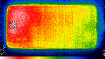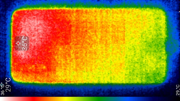 Нагрев больше в верхней левой части аппарата, что, видимо, соответствует расположению микросхемы SoC. По данным теплокамеры, максимальный нагрев составил всего 36 градусов (при температуре окружающего воздуха в 24 градуса), это относительно немного.