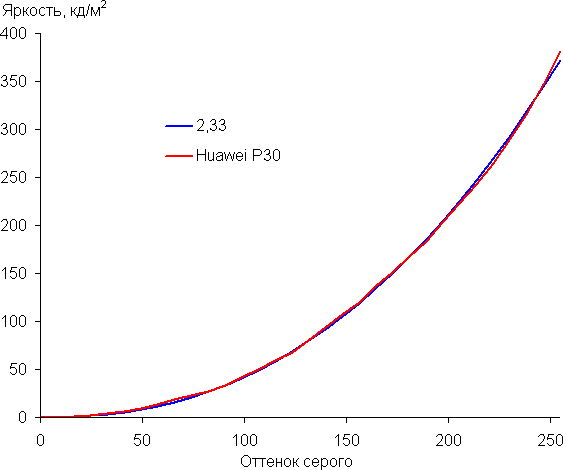 Напомним, что в случае OLED-экранов яркость фрагментов изображения динамично меняется в соответствии с характером выводимого изображения — чуть уменьшается для светлых в целом изображений. В итоге полученная зависимость яркости от оттенка (гамма-кривая), скорее всего, не соответствует гамма-кривой статичного изображения, так как измерения проводились при последовательном выводе оттенков серого почти на весь экран.