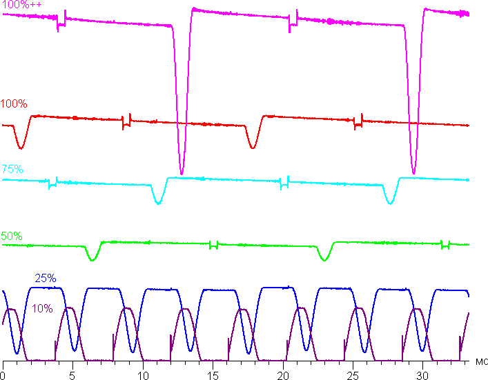 Только на низком уровне яркости появляется значимая модуляция с частотой 240 Гц. На рисунке ниже приведены зависимости яркости (вертикальная ось) от времени (горизонтальная ось) для нескольких значений настройки яркости (100%++ — это с дополнительной засветкой датчика освещенности ярким светом):