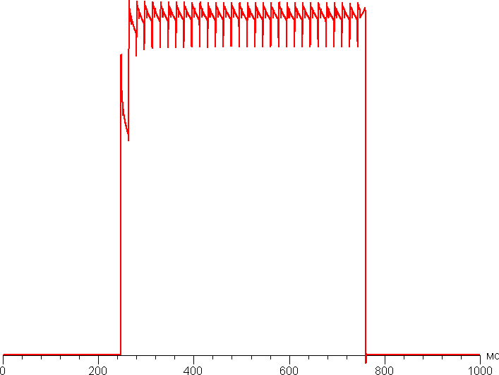 Переключение состояния элементов матрицы выполняется практически мгновенно, но на фронте включения может присутствовать ступенька шириной примерно 17 мс (что соответствует частоте обновления экрана в 60 Гц). Например, так выглядит зависимость яркости от времени при переходе от черного к белому и обратно:
