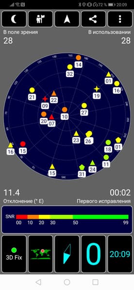 Навигационный модуль работает с GPS (двухчастотный, с A-GPS), с отечественной Глонасс, с китайской Beidou и с европейской Galileo. Первые спутники при холодном старте обнаруживаются быстро, в течение первых же секунд, точность позиционирования не вызывает претензий. Магнитный компас, необходимый для навигационных программ, среди датчиков смартфона имеется.