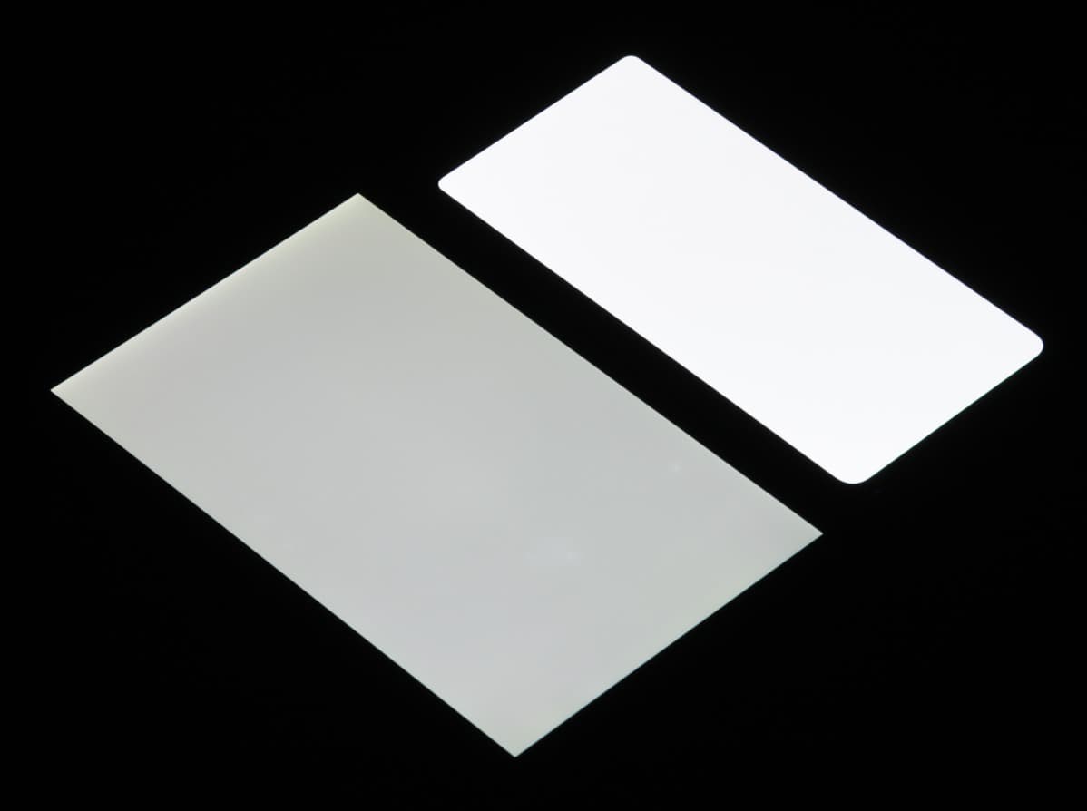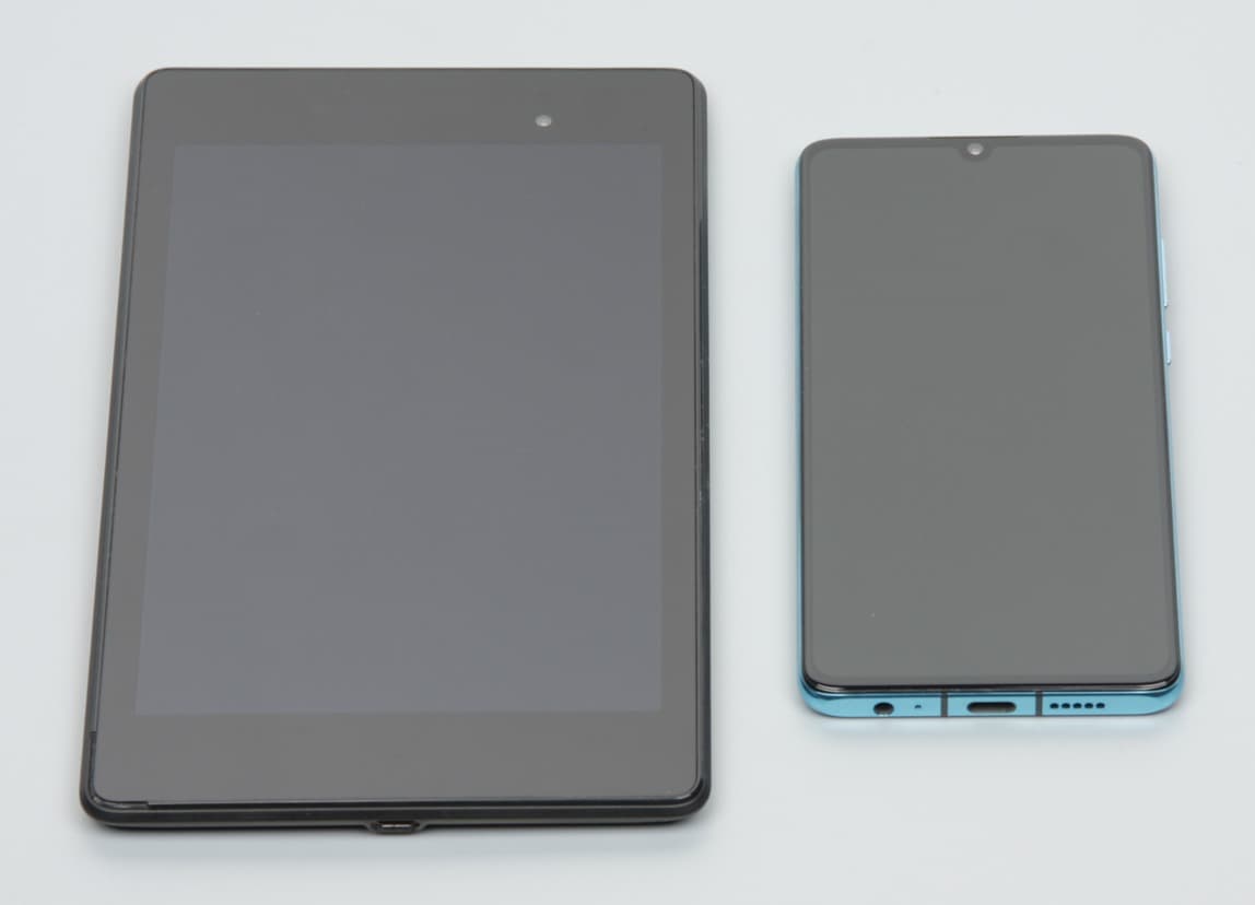 Лицевая поверхность экрана выполнена в виде стеклянной пластины с зеркально-гладкой поверхностью, устойчивой к появлению царапин. Судя по отражению объектов, антибликовые свойства экрана не хуже, чем у экрана Google Nexus 7 (2013) (далее просто Nexus 7). Для наглядности приведем фотографию, на которой в выключенных экранах отражается белая поверхность (слева — Nexus 7, справа — Huawei P30, далее их можно различать по размеру):