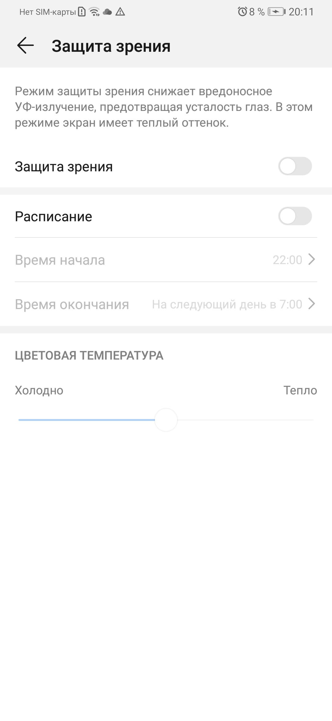 В ее описании, конечно, приведен традиционный бред про вредоносное УФ-излучение и усталость глаз, но такая коррекция, в принципе, может быть полезной, что разъяснено в нашей статье про iPad Pro 9,7″. Однако в любом случае, при развлечении с планшетом или смартфоном на ночь глядя лучше снизить яркость экрана до минимального, но еще комфортного уровня. Дополнительно желтить экран никакого смысла нет.