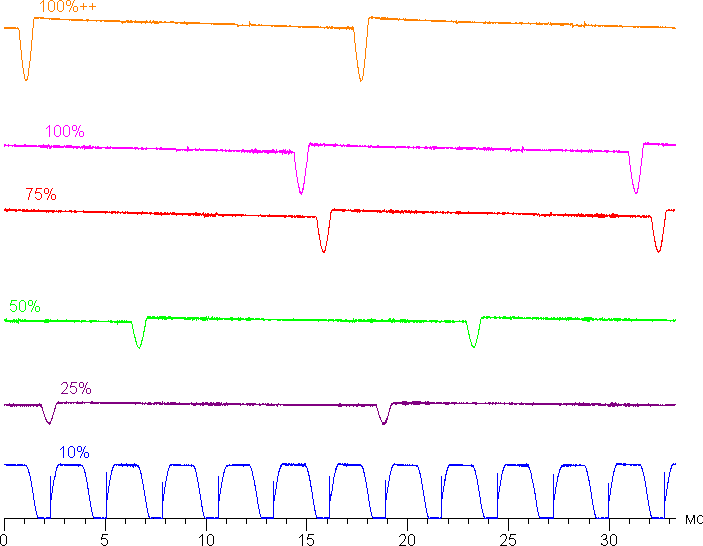 На любом уровне яркости присутствует значимая модуляция с частотой 60, 90 или 360 Гц. На рисунке ниже приведены зависимости яркости (вертикальная ось) от времени (горизонтальная ось) для нескольких значений настройки яркости. Сначала для режима с частотой обновления 60 Гц: