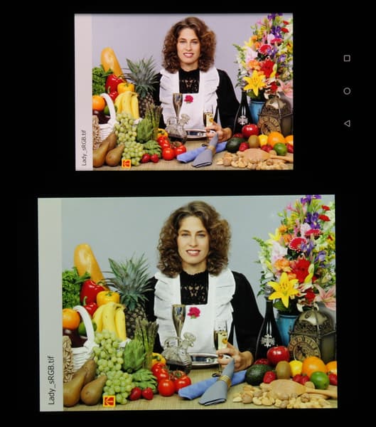 По критерию вывода кадров качество воспроизведения видеофайлов очень хорошее, так как кадры или группы кадров могут (но не обязаны) выводиться с равномерным чередованием интервалов и без пропусков. При воспроизведении видеофайлов с разрешением 1920 на 1080 пикселей (1080p) изображение собственно видеофайла выводится точно по высоте экрана (при ландшафтной ориентации) с интерполяцией к разрешению экрана, и конечно, часть картинки оказывается на загнутых краях с соответствующим искажением яркости и цвета. Можно переключиться в режим один-в-один по пикселям, тогда вывод будет в истинном разрешении Full HD и с минимальным заходом на загнутые края. Однако при этом уже проявляются особенности PenTile: вертикальная мира через пиксель в сеточку, но на горизонтальной нет привычной для PenTile зеленоватости. Это наблюдается на тестовых мирах, а на реальных кадрах описываемые артефакты в любом случае не видны. Отображаемый на экране диапазон яркости соответствует стандартному диапазону 16—235: в тенях и в светах отображаются все градации оттенков. Отметим, что в этом смартфоне есть поддержка аппаратного декодирования файлов H.265 с глубиной цвета 10 бит на цвет, при этом вывод градиентов на экран осуществляется с лучшим качеством, чем в случае 8-битных файлов (впрочем, это не доказательство истинного 10-битного вывода). Также поддерживается отображение файлов HDR (HDR10, HEVC).