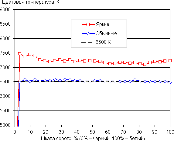 В случае профиля Обычные баланс оттенков на шкале серого хороший, так как на цветовая температура близка к стандартным 6500 К, и отклонение от спектра абсолютно черного тела (ΔE) ниже 10, что для потребительского устройства считается неплохим показателем. При этом цветовая температура и ΔE мало изменяются от оттенка к оттенку — это положительно сказывается на визуальной оценке цветового баланса. (Самые темные области шкалы серого можно не учитывать, так как там баланс цветов не имеет большого значения, да и погрешность измерений цветовых характеристик на низкой яркости большая.)