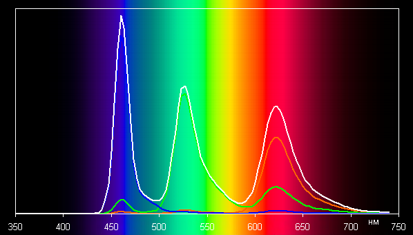 Впрочем, в случае профиля Обычные даже без коррекции баланс оттенков на шкале серого хороший, так как цветовая температура немного выше стандартных 6500 К, и отклонение от спектра абсолютно черного тела (ΔE) ниже 10 единиц, что для потребительского устройства считается хорошим показателем. При этом цветовая температура и ΔE мало изменяются от оттенка к оттенку — это положительно сказывается на визуальной оценке цветового баланса. (Самые темные области шкалы серого можно не учитывать, так как там баланс цветов не имеет большого значения, да и погрешность измерений цветовых характеристик на низкой яркости большая.)