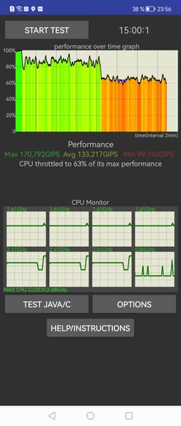 Тестирование традиционно проводилось на обычном уровне энергопотребления без использования функций энергосбережения, хотя таковые в аппарате имеются. Условия тестирования: выставлен минимальный комфортный уровень яркости (примерно 100 кд/м²). Тесты: беспрерывное чтение в программе Moon+ Reader (со стандартной, светлой темой); беспрерывный просмотр видео в HD-качестве (720р) через домашнюю сеть Wi-Fi; игра Injustice 2 с автонастройками графики.