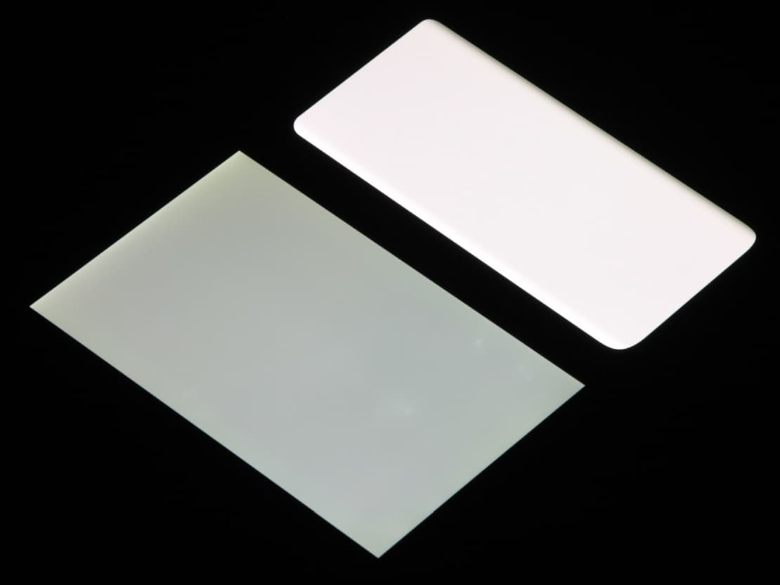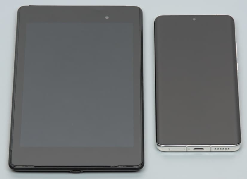Лицевая поверхность экрана выполнена в виде стеклянной пластины с зеркально-гладкой поверхностью, устойчивой к появлению царапин. Судя по отражению объектов, антибликовые свойства экрана лучше, чем у экрана Google Nexus 7 (2013) (далее просто Nexus 7). Для наглядности приведем фотографию, на которой в выключенных экранах отражается белая поверхность (слева — Nexus 7, справа — Huawei P50 Pro, далее их можно различать по размеру):