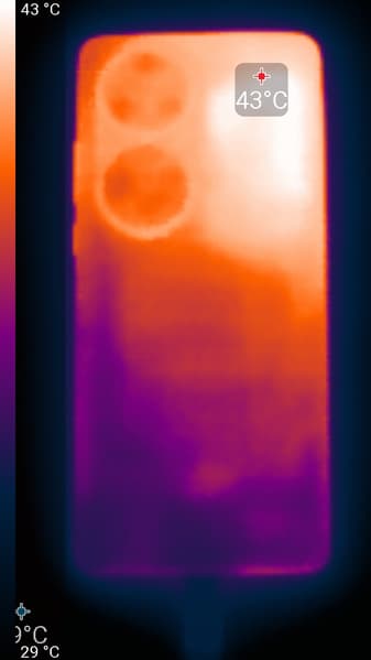 Нагрев больше в верхней части аппарата, что, видимо, соответствует расположению микросхемы SoC. По данным теплокамеры, максимальный нагрев составил 43 градуса (при температуре окружающего воздуха в 24 градуса), это несколько выше среднего значения в данном тесте для современных смартфонов.