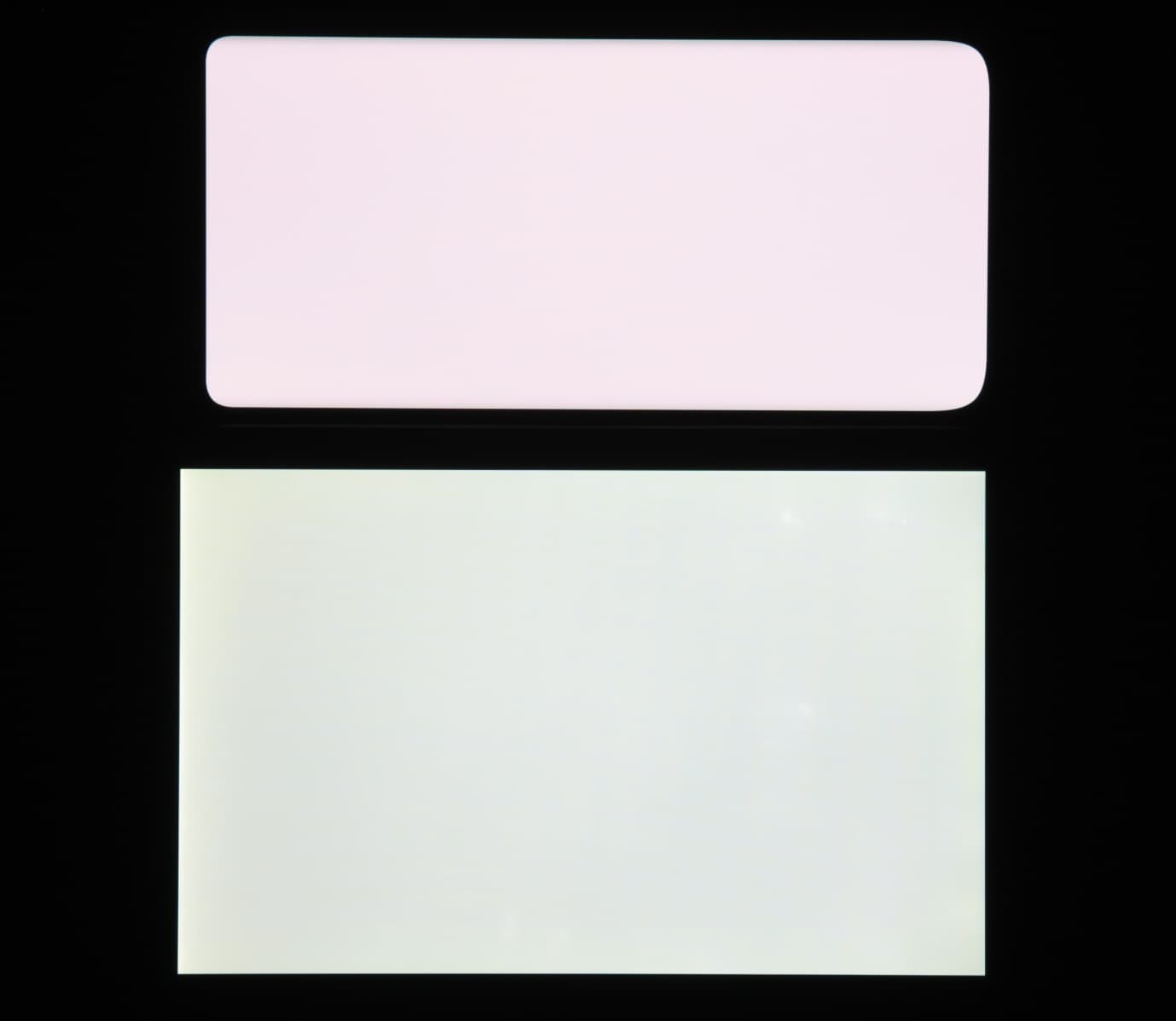 Экран характеризуется великолепными углами обзора. Даже белый цвет при отклонении меняет оттенок лишь в малой степени, что для AMOLED-экранов редкость. Черный цвет остается просто черным под любыми углами. Он настолько черный, что параметр контрастности в данном случае неприменим. Для сравнения приведем фотографии, на которых на экраны Huawei P50 Pro и второго участника сравнения выведены одинаковые изображения, при этом яркость экранов изначально установлена примерно на 200 кд/м², а цветовой баланс на фотоаппарате принудительно переключен на 6500 К.