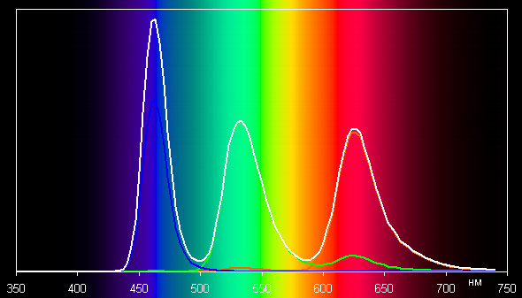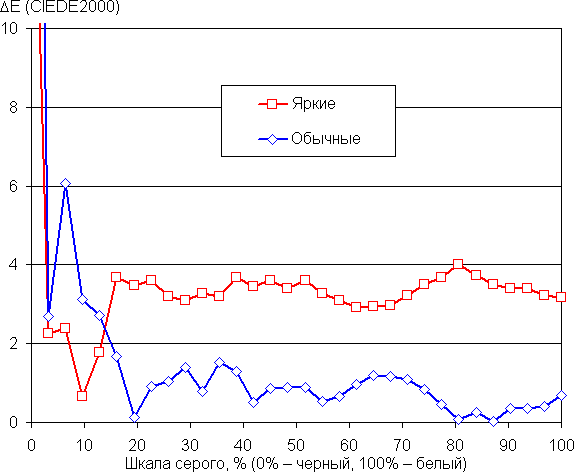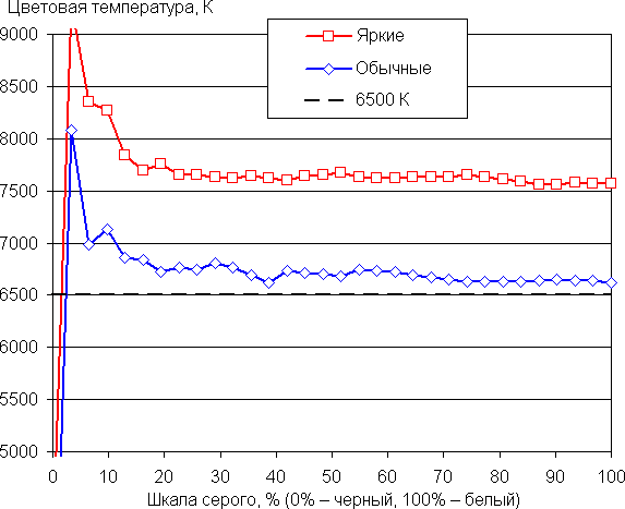 Впрочем, в случае профиля Обычные даже без коррекции баланс оттенков на шкале серого хороший, так как цветовая температура немного выше стандартных 6500 К, и отклонение от спектра абсолютно черного тела (ΔE) ниже 3 единиц, что для профессионального устройства считается хорошим показателем. При этом цветовая температура и ΔE мало изменяются от оттенка к оттенку — это положительно сказывается на визуальной оценке цветового баланса. (Самые темные области шкалы серого можно не учитывать, так как там баланс цветов не имеет большого значения, да и погрешность измерений цветовых характеристик на низкой яркости большая.)