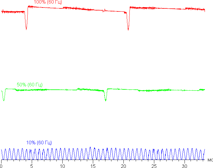 На высоком и среднем уровне яркости присутствует значимая модуляция с частотой примерно 60 или 120 Гц. На рисунке ниже приведены зависимости яркости (вертикальная ось) от времени (горизонтальная ось) для нескольких значений настройки яркости. Сначала для режима с частотой обновления 60 Гц:
