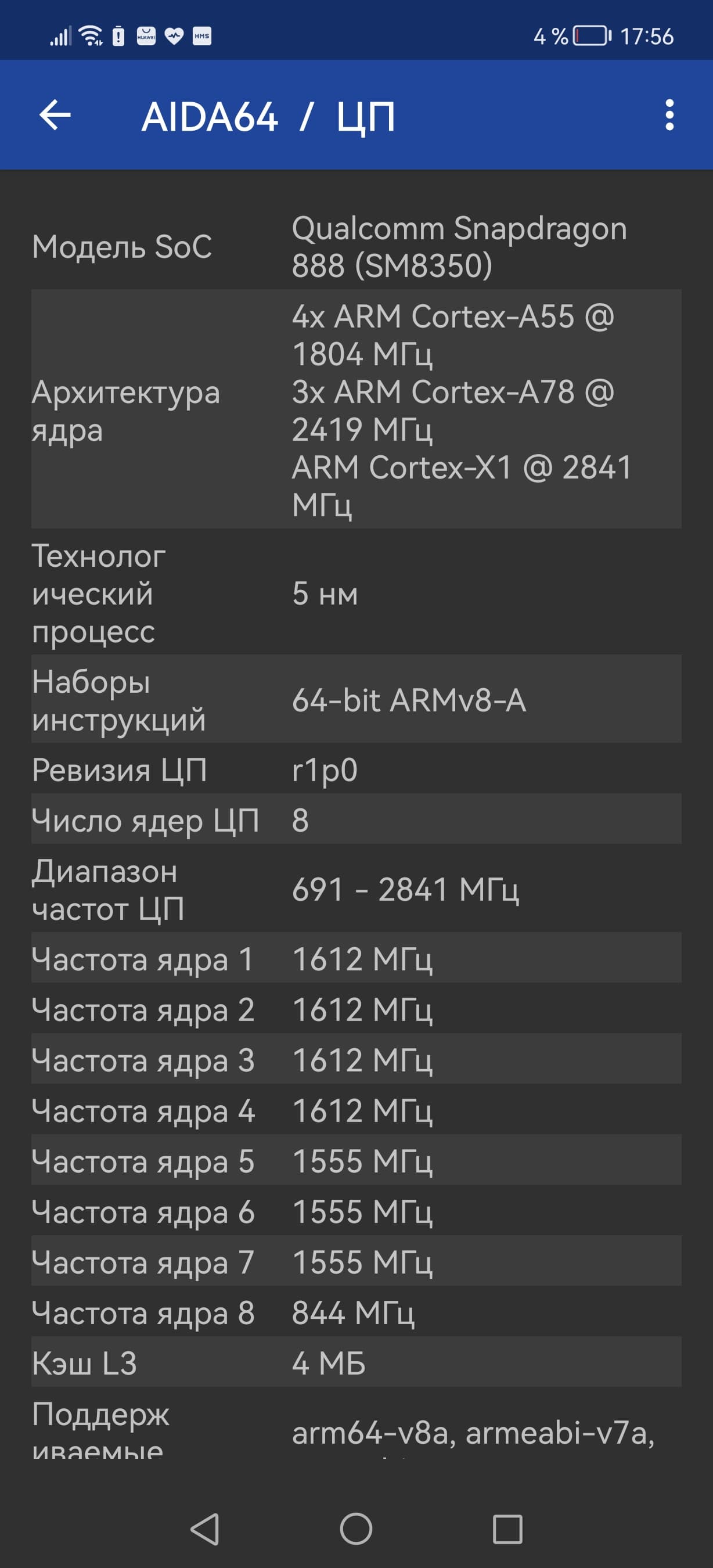- SoC Qualcomm SM8350 Snapdragon 888 4G, 8 процессорных ядер (1×Cortex-X1 @2,84 ГГц + 3×Cortex-A78 @2,42 ГГц + 4×Cortex-A55 @1,80 ГГц)