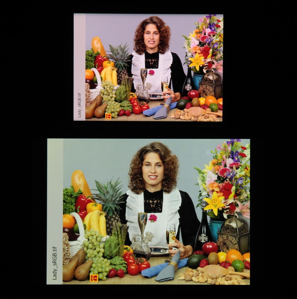 Отметим, что на экранах с широким цветовым охватом (без соответствующей коррекции) цвета́ обычных изображений, оптимизированных для устройств sRGB, выглядят неестественно насыщенными. Отсюда и рекомендация: в большинстве случаев смотреть кино, фотографии и все естественное лучше при выборе профиля Обычные, и только если фотография или видео имеют охват DCI-P3, принятый в цифровом кинематографе и «родной» для топовых устройств Apple, имеет смысл переключить профиль на Яркие.