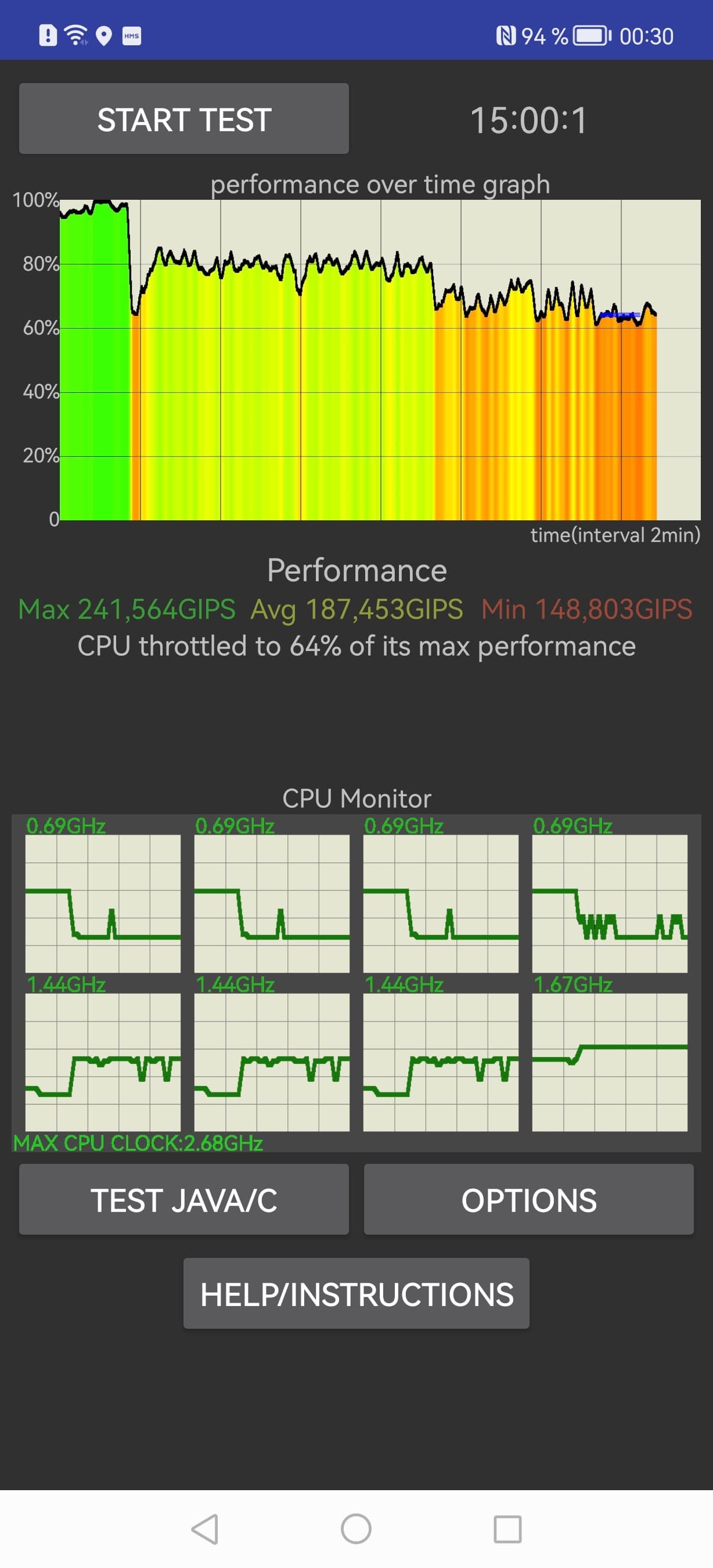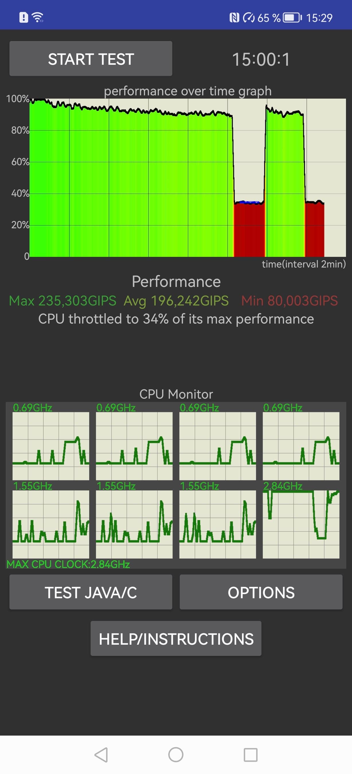 Тестирование традиционно проводилось на обычном уровне энергопотребления без использования функций энергосбережения, хотя таковые в аппарате имеются. Условия тестирования: выставлен минимальный комфортный уровень яркости (примерно 100 кд/м²). Тесты: беспрерывное чтение в программе Moon+ Reader (со стандартной, светлой темой); беспрерывный просмотр видео в HD-качестве (720р) через домашнюю сеть Wi-Fi; игра Injustice 2 с автонастройками графики.