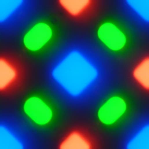 В этом экране используется матрица AMOLED — активная матрица на органических светодиодах. Полноцветное изображение создается с помощью субпикселей трех цветов — красного (R), зеленого (G) и синего (B), но красных и синих субпикселей в два раза меньше, что можно обозначить как RGBG. Это подтверждается фрагментом микрофотографии: