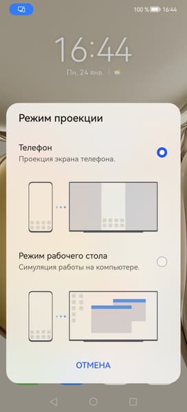 Во втором случае при портретной ориентации экрана смартфона картинка на экране ТВ выводится вписанной по высоте и с широкими черными полями по бокам, а при ландшафтной — вписанной по ширине с узкими черными полями сверху и снизу. Вывода точка в точку в обоих вариантах нет.
