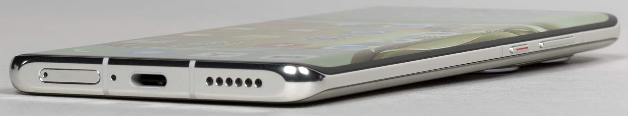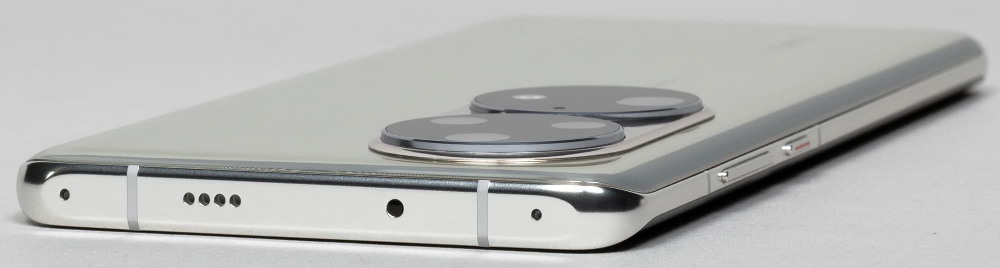 Размер корпуса не самый крупный, но и не миниатюрный. Без чехла смартфон помещается в руку легко, но удерживается за счет округлых боковин плохо, так и норовит выскользнуть. Предыдущий P40 Pro лучше удерживался в руке. У смартфона практически нет рамки по бокам от экрана, в некоторых приложениях элементы интерфейса налезают на загнутые боковины, это приводит к ошибочным касаниям и плохо выглядит.