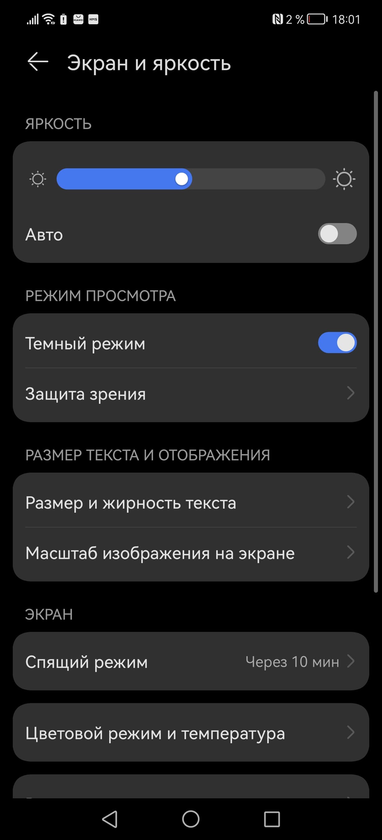 При выводе белого поля во весь экран и при ручном управлении яркостью ее максимальное значение составило порядка 590 кд/м² в обычных условиях, а на очень ярком свету оно повышается до 780 кд/м² (не на долго и если нагрев смартфона умеренный). В данном случае чем меньше площадь белого на экране, тем он светлее, то есть фактическая максимальная яркость белых участков будет почти всегда выше указанных значений. В итоге читаемость экрана днем на солнце должна быть на хорошем уровне. Минимальное значение яркости — 1,7 кд/м², то есть пониженный уровень яркости без проблем позволяет использовать устройство даже в полной темноте. Работает автоматическая регулировка яркости по датчику освещенности (он расположен под экраном справа от камеры). Работа этой функции зависит от положения ползунка регулировки яркости: им пользователь может попытаться выставить желаемый уровень яркости в текущих условиях. Если оставить все по умолчанию, то в полной темноте функция автояркости уменьшает яркость до 6 кд/м² (очень темно), в условиях освещенного искусственным светом офиса (примерно 550 лк) устанавливает на 110 кд/м² (нормально), в очень ярком окружении (условно соответствует нахождению на прямом солнечном свету) повышает до 590 кд/м² (достаточно). Результат нас не совсем устроил, поэтому мы в полной темноте чуть увеличили яркость, получив для трех условий, указанных выше, следующие значения: 20, 110, 590 кд/м² (что и было нужно). Получается, что функция автоподстройки яркости работает адекватно и в какой-то степени позволяет пользователю настраивать свою работу под индивидуальные требования.