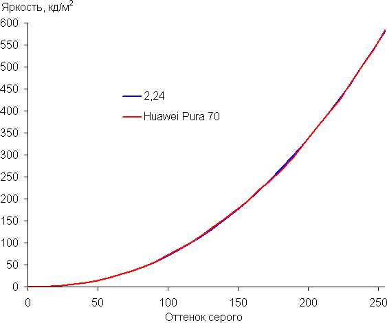 Напомним, что в случае OLED-экранов яркость фрагментов изображения динамично меняется в соответствии с характером выводимого изображения — чуть уменьшается для светлых в целом изображений. В итоге полученная зависимость яркости от оттенка (гамма-кривая), скорее всего, не соответствует гамма-кривой статичного изображения, так как измерения проводились при последовательном выводе оттенков серого почти на весь экран.
